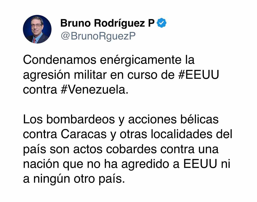 El canciller de Cuba Bruno Rodríguez, condenó hoy la agresión militar en curso perpetrada por Estados Unidos en Venezuela mediante el uso de misiles.