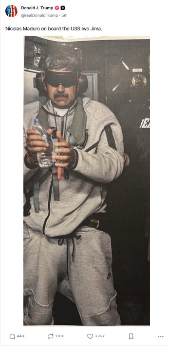 Donald Trump publica la primera foto del presidente Nicolás Maduro tras su secuestro esta madrugada en Venezuela.