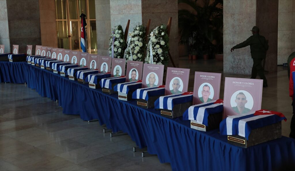 Tras emotiva ceremonia militar en homenaje a los 32 combatientes cubanos caídos en el ataque a Venezuela, la guardia de honor comenzó el traslado de sus restos mortales desde el aeropuerto internacional José Martí, de esta capital, por la Avenida Rancho Boyeros, hasta la sede del Ministerio de las Fuerzas Armadas Revolucionarias (Minfar).